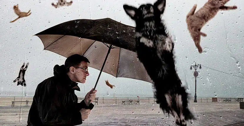 “Raining cats and dogs”λ μμ΄λ‘ “λΉκ° λ§€μ° λ§μ΄ λ΄λ¦°λ€”λ λ»μ΄λ€. νν λ§νλ ‘νμ°’λ ‘μ΅μκ°μ΄ μμμ§λ λΉ’λ₯Ό ννν λ μ¬μ©νλ€.