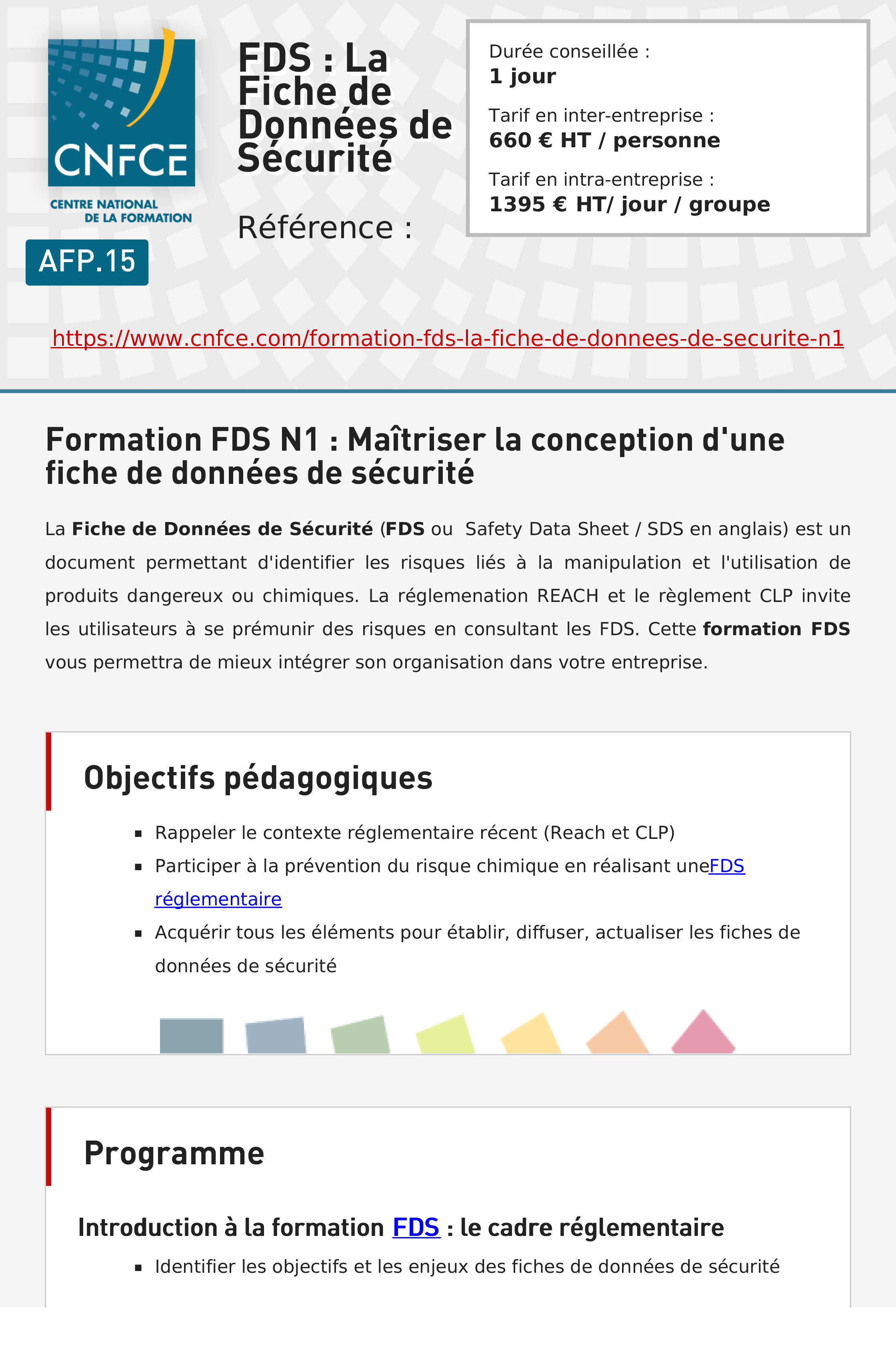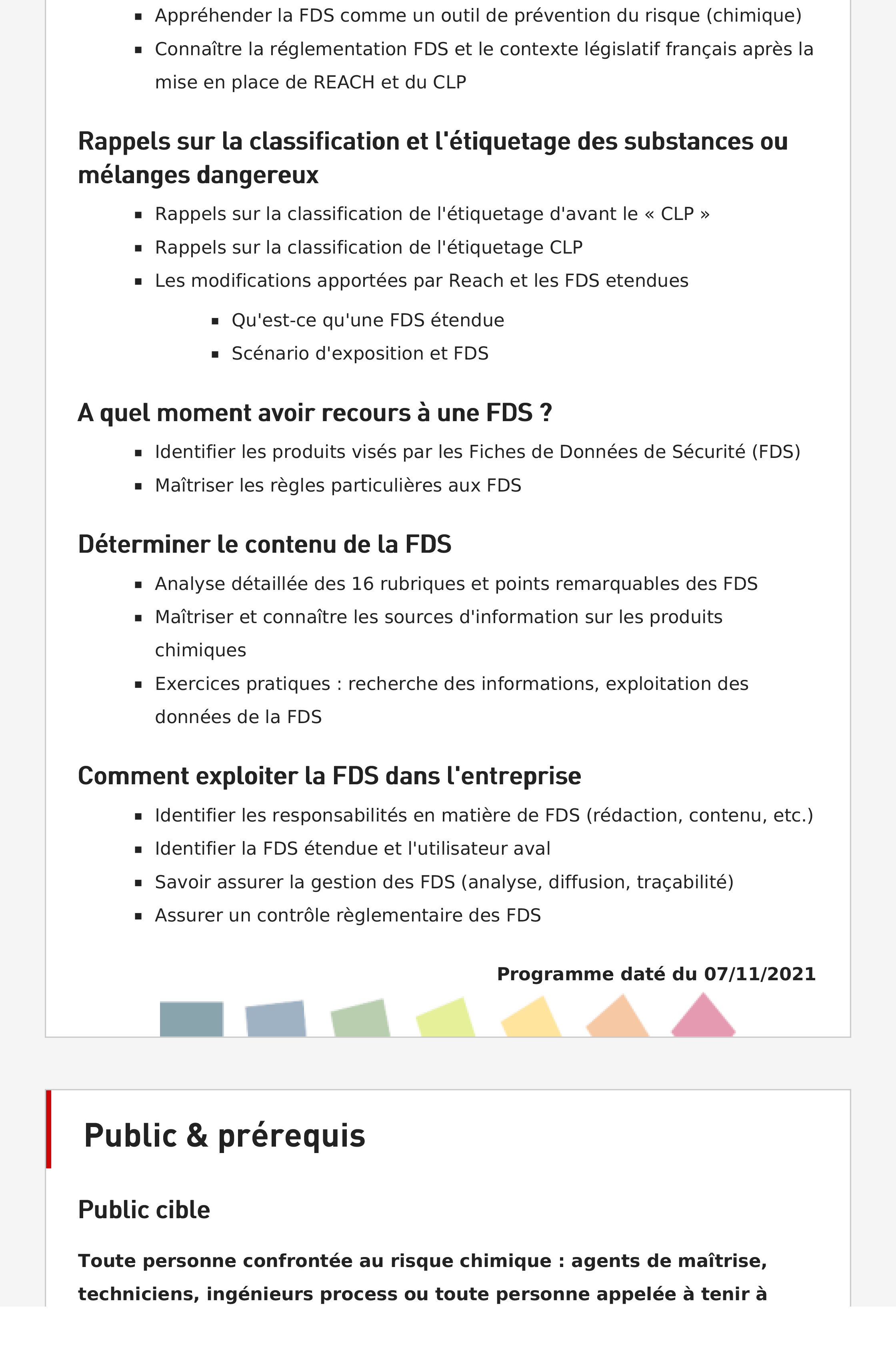 La Fiche de Données de Sécurité (FDS ou Safety Data Sheet / SDS en anglais) est un document permettant d'identifier les risques liés à la manipulation et l'utilisation de produits dangereux ou chimiques. La réglemenation REACH et le règlement CLP invite les utilisateurs à se prémunir des risques en consultant les FDS. Cette formation FDS